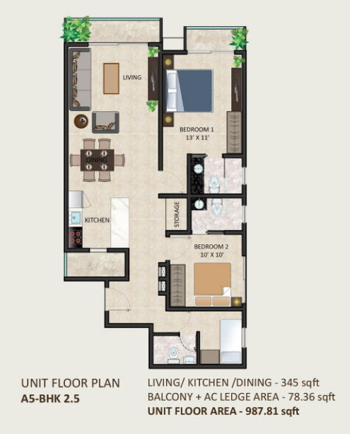 | A5-BHK 2.5 | Balcony + AC Ledge area | 78.36 sqft |